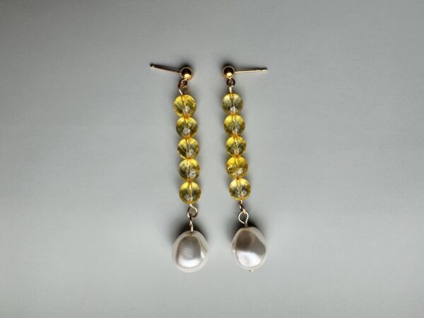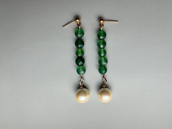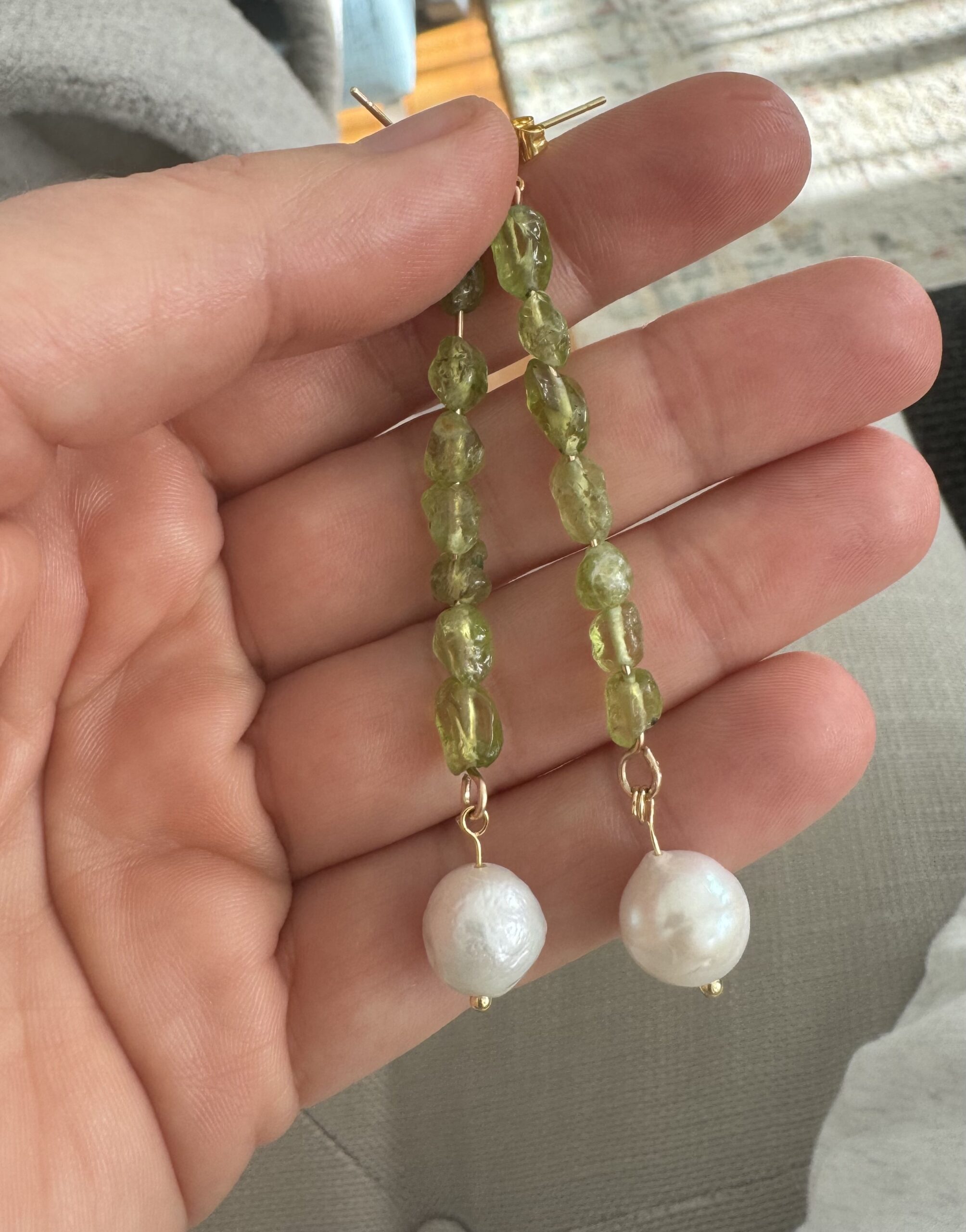 These earrings bring together the natural beauty of semiprecious stones and the timeless glow of pearls in a striking 3-inch silhouette. Whether you go for vibrant peridot, deep green agate, golden citrine, or another stone in the series, each pair features a row of faceted gemstones leading to a luminous freshwater pearl drop.